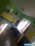 зал совмещен с кухней - диван и кресло, кухонный стол и стулья ,тумба с телевизором , холодильник, гарнитур и плита газовая.