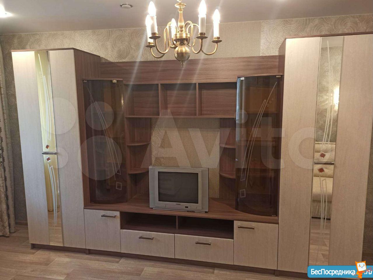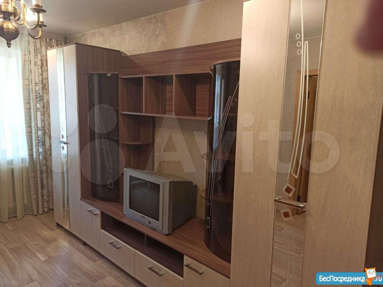 В комнате есть диван, шкаф, стол, телевизор. В квартире есть холодильник и стиральная машина. Комната изолированная. Светлая.