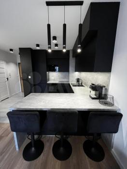 Диван-кровать с хорошими матрасами и местом для хранения белья(160*200), удобное кресло. В зоне кухни высокий барный стол и стулья для удобного расположения за ним. В квартире есть все необходимое: индукционная плита, чайник, микроволновая печь, посуда, полноразмерный холодильник, стиральная машина, телевизор.