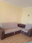 На кухне-гостиной стоит комплект кухонной мебели, обеденный стол, 4 стула, 2-х спальный раскладывающийся диван, новая электрическая плита, мощная вытяжка, 2-х камерный холодильник, телевизор, посуда, сушка.