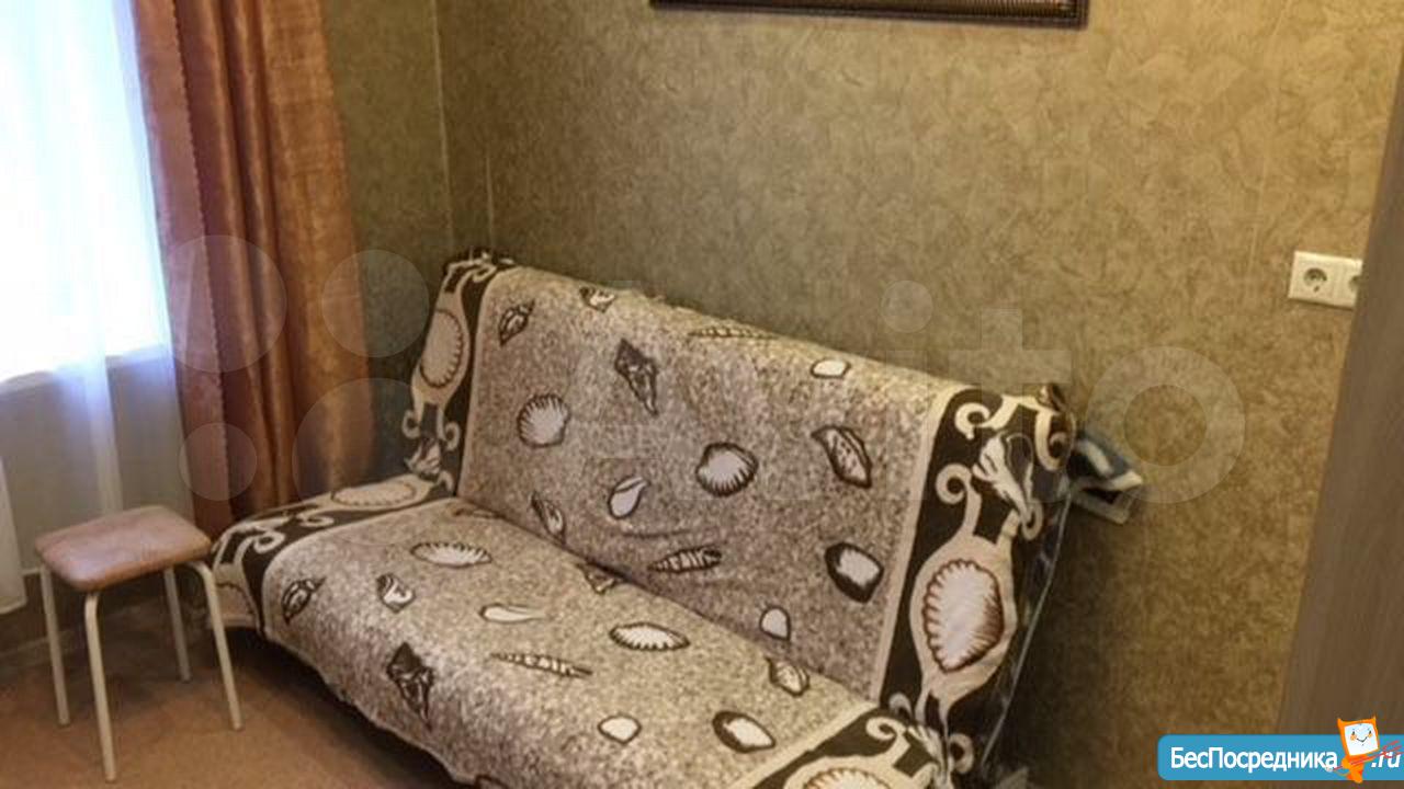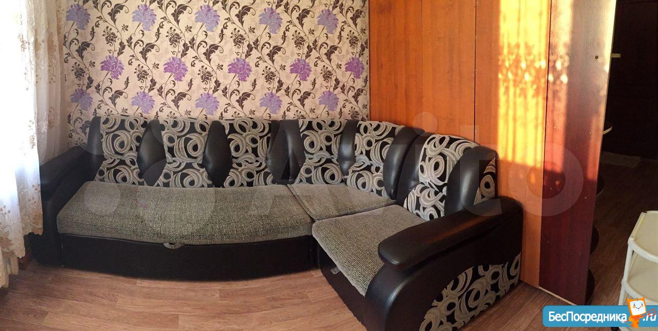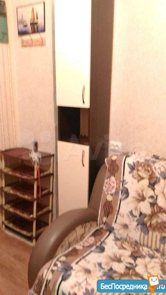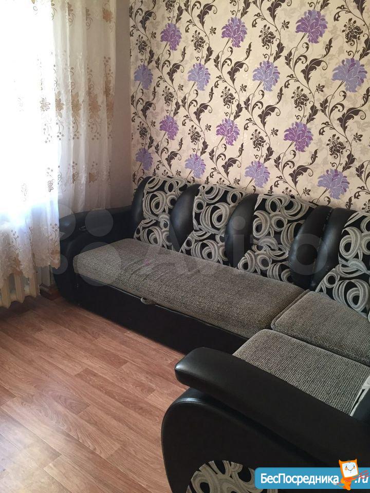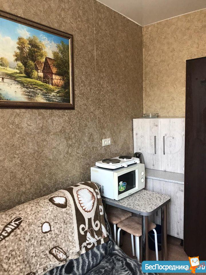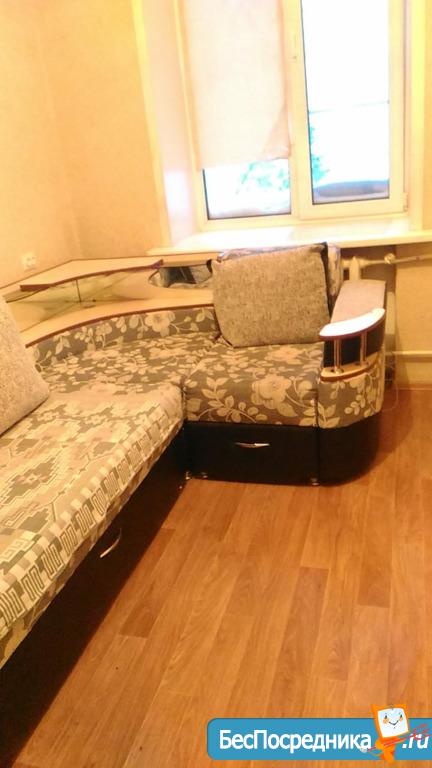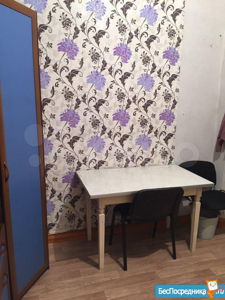 Чистая уютная комната в общежитии (5 этаж) коридорного типа. Комната 19 кв.м. разделена на две, в одной- диван, софа, тумбочка. Во второй -кухонный гарнитур, кухонный уголок со столом, большой угловой шкаф, холодильник, микроволновая печь, эл.плита,чайник. Также имеется стиральная машина. Туалет на этаже, душевые на 1 этаже. Сдается на длительный срок. (Залог 5000 руб.)