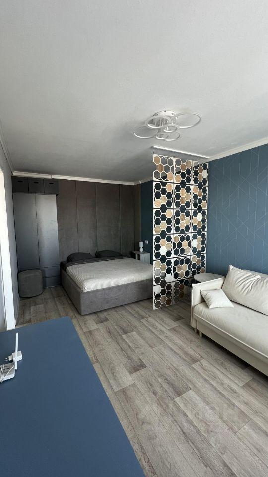 Мебель: кровать с мягкими стеновыми панелями, с подъемным механизмом и большим местом для хранения, матрас 160х200см, шкаф платяной (80х200см) с двумя выкатными ящиками, комод из натурального дерева, диван раскладной в стиле сканди (спальное место 120х190см), кухонный гарнитур, круглый стол, два стула, выкатная этажерка.