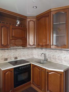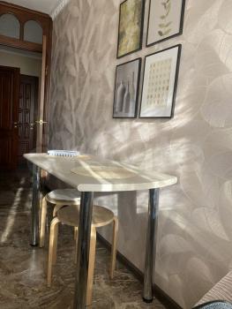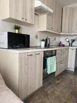 Кухня: гарнитур, встроенная плита с духовым шкафом, новый: стол, две табуретки, холодильник. (возможно приобретение чайника, посуды по договоренности)