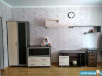 Комната: диван (раскладной), телевизор, журнальный столик, подвесные полки, компьютерный стол.