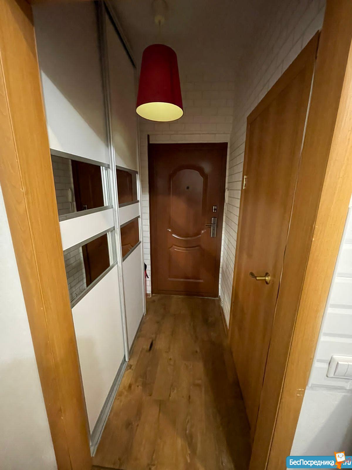 Комната правильной квадратной формы, большой санузел, лоджия застеклена. В просторной прихожей имеется шкаф, в котором можно разместить всю "верхнюю одежду", комната полностью укомплектована: диван, шкаф, кухня, барная стойка, холодильник, плита, вытяжка, телевизор и небольшой столик. В ванной комнате установлена стиральная машина.