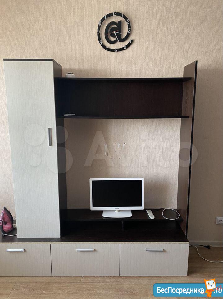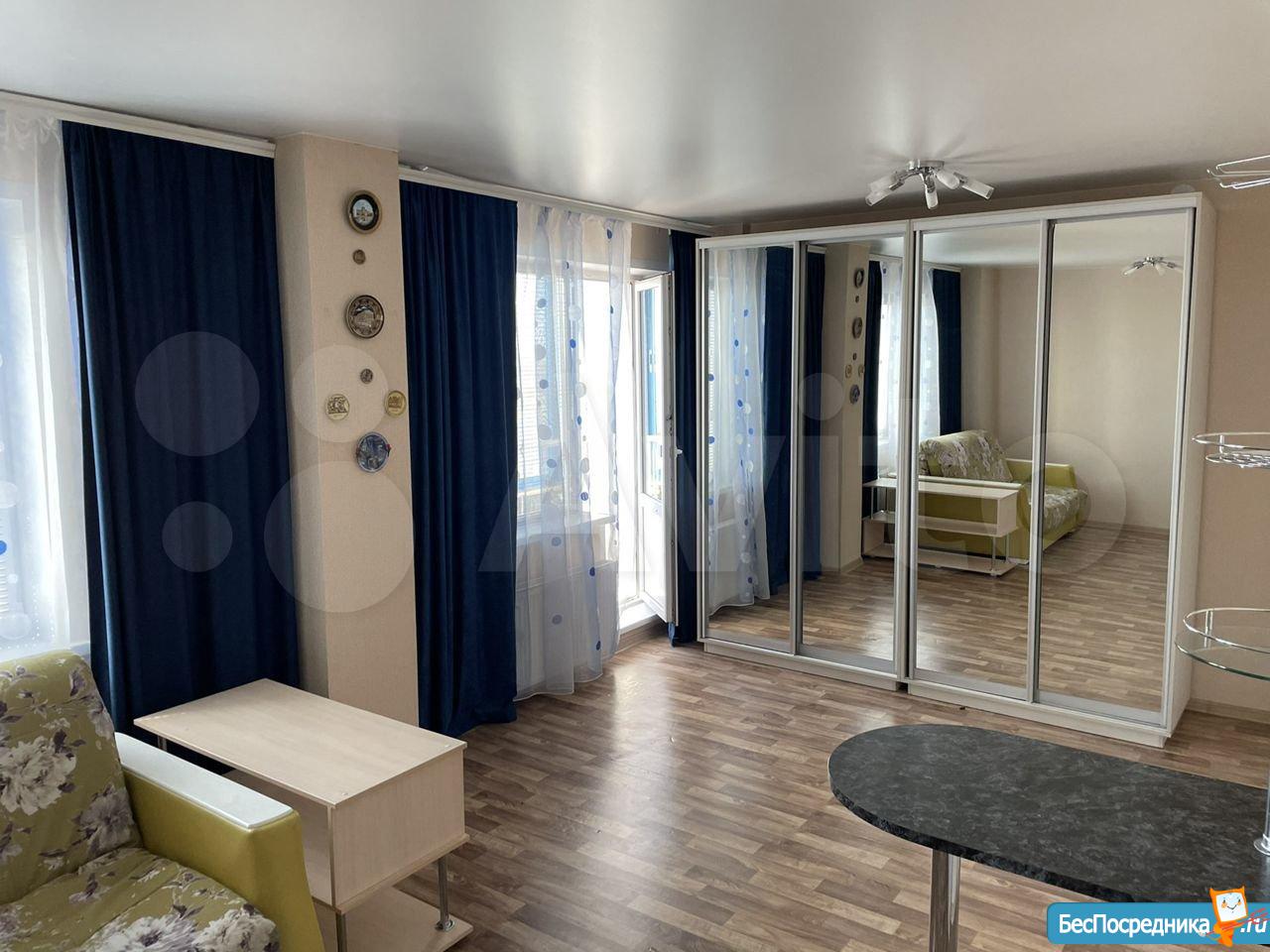 Уютная квартира студия в новом доме. С мебелью, со всей техникой ( телевизор, холодильник, микроволновка, чайник) .