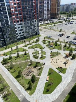 Современный двор без машин с детской площадкой и зонами отдыха. Большая парковка около дома. В подъездах по 2 лифта, есть колясочная.
