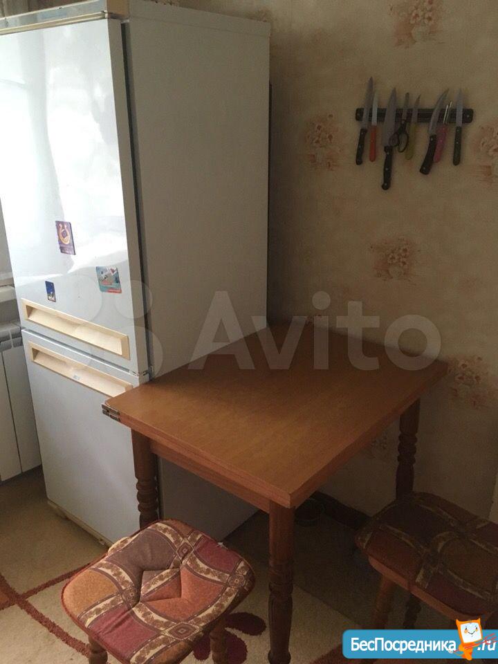 На кухне стол, хороший двухкамерный холодильник, полноценная электрическая плита с духовкой, вытяжка, встроенные шкафы. Есть электрический чайник, 2 табуретки.