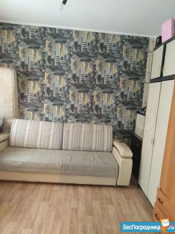 Студия с ремонтом. Есть холодильник, стиральная машинка. Большой диван.