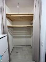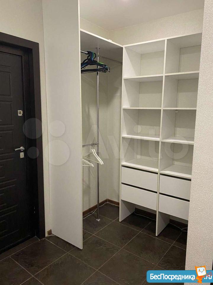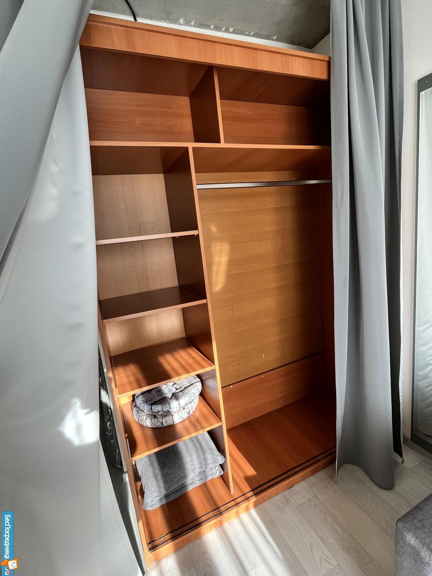 У спальной зоны размещены дополнительные места хранения до самого потолка, также в зале большой вместительный шкаф.