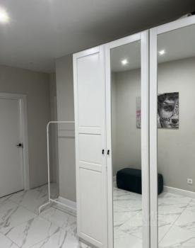 - В прихожей: большой встроенный шкаф, этажерка для обуви, зеркало