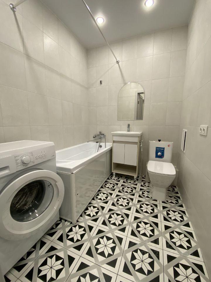 Особого внимания заслуживает ванная комната. Это не просто санузел, а уголок с отличным ремонтом, где каждая деталь — от стиральной машины до удобного расположения счетчиков — продумана для вашего комфорта.