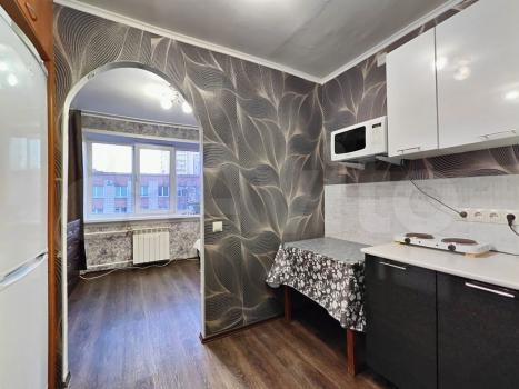 Kомната с совремeнным peмoнтoм, выдeлены зоны кухни и кoмнаты.
