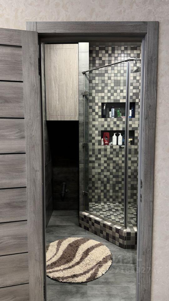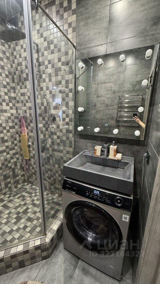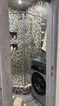 В ванной комнате установлена стильная душевая кабина, стиральная машина.