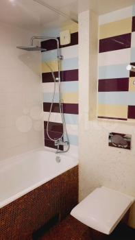 Санузел совмещенный, просторный, оформлен современной плиткой. Лоджия застеклена и выходит на живописный вид из окон.