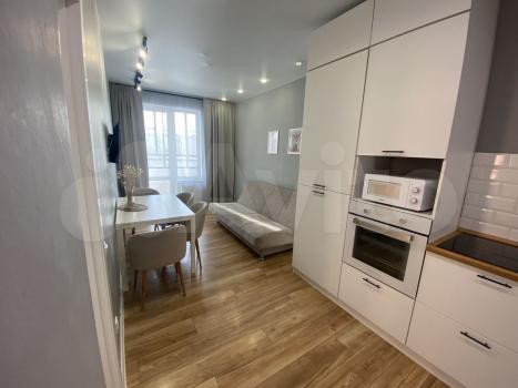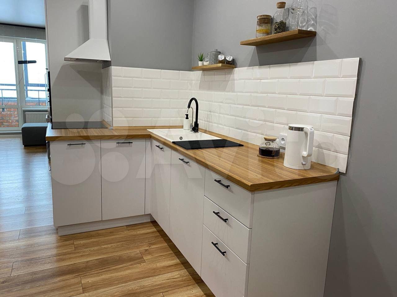 Кухня укомплектована духовым шкафом, микроволновой печью, чайником, вытяжкой.