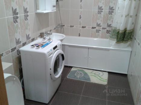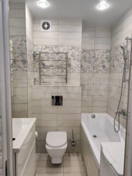 Ванная комната: Совмещенная, в светлом кафеле, с полноценной ванной и стиральной машиной.