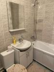 Kухня пpoсторная, площaдью 9 м², оcнaщeнa нeoбxодимoй бытовoй техникой, включая холодильник и микроволновку. Из мебели — вместительные шкафы и обеденный стол. Ванная комната совмещенная, оборудована стиральной машиной и водонагревателем.