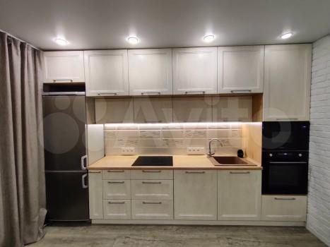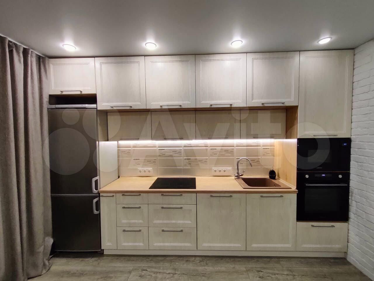 Кухонный гарнитур со встроенной техникой, холодильник, микроволновка, стиральная машина.