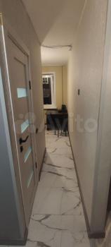 В квартире выполнен косметический ремонт. Просторная кухня площадью 12 м² оснащена необходимой мебелью и техникой, включая холодильник и стиральную машину. В гостиной установлен диван и шкафы для хранения вещей.