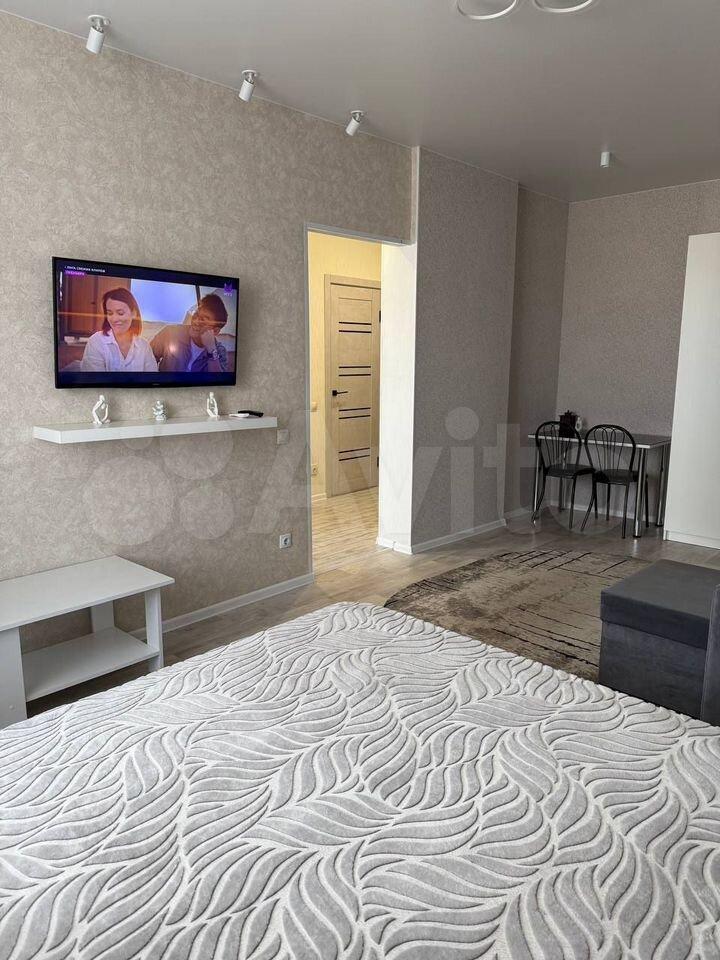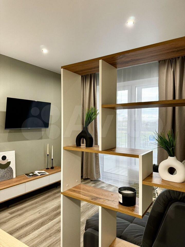 В квартире выполнен свежий евро ремонт. Гостиная оформлена стильно и современно, оснащена шкафами и телевизором. Из окон открывается приятный вид на город.