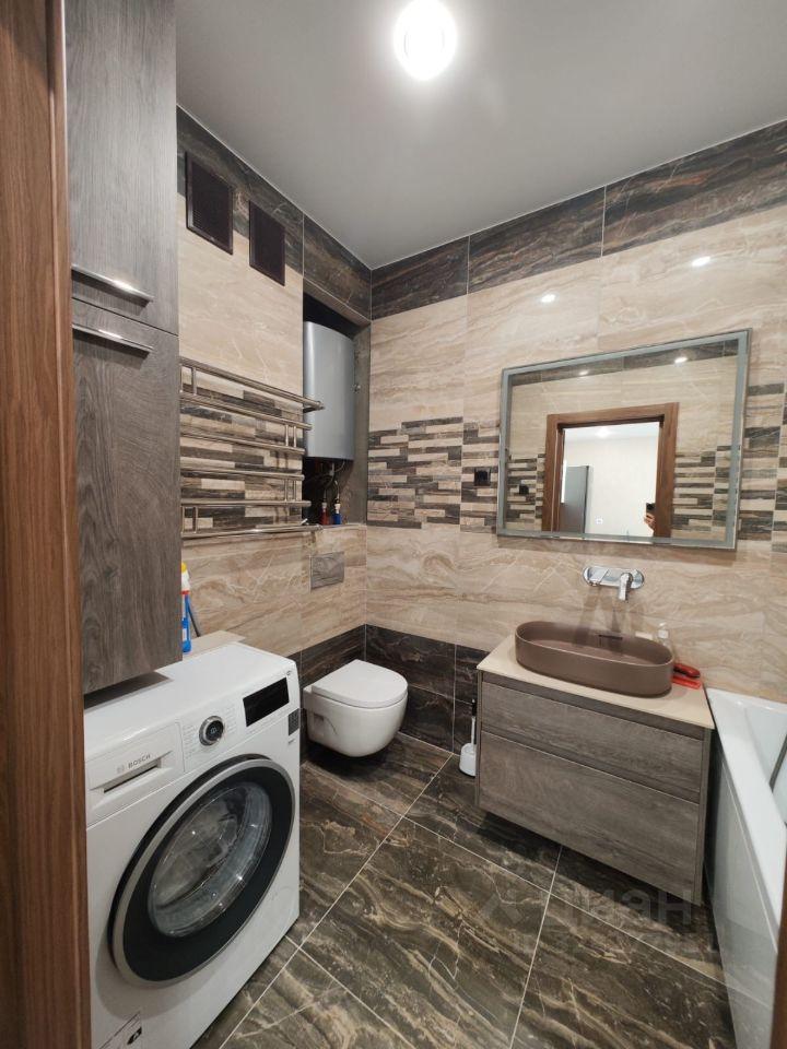 В санузеле установлена новая стиральная машина, тумба, шкаф с зеркалом и подсветкой, душевая кабина.