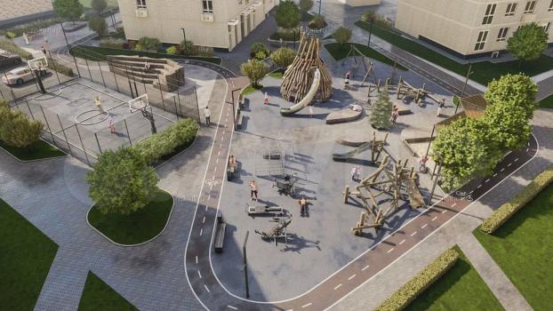 Охраняемая территория с детской площадкой и футбольным полем.
