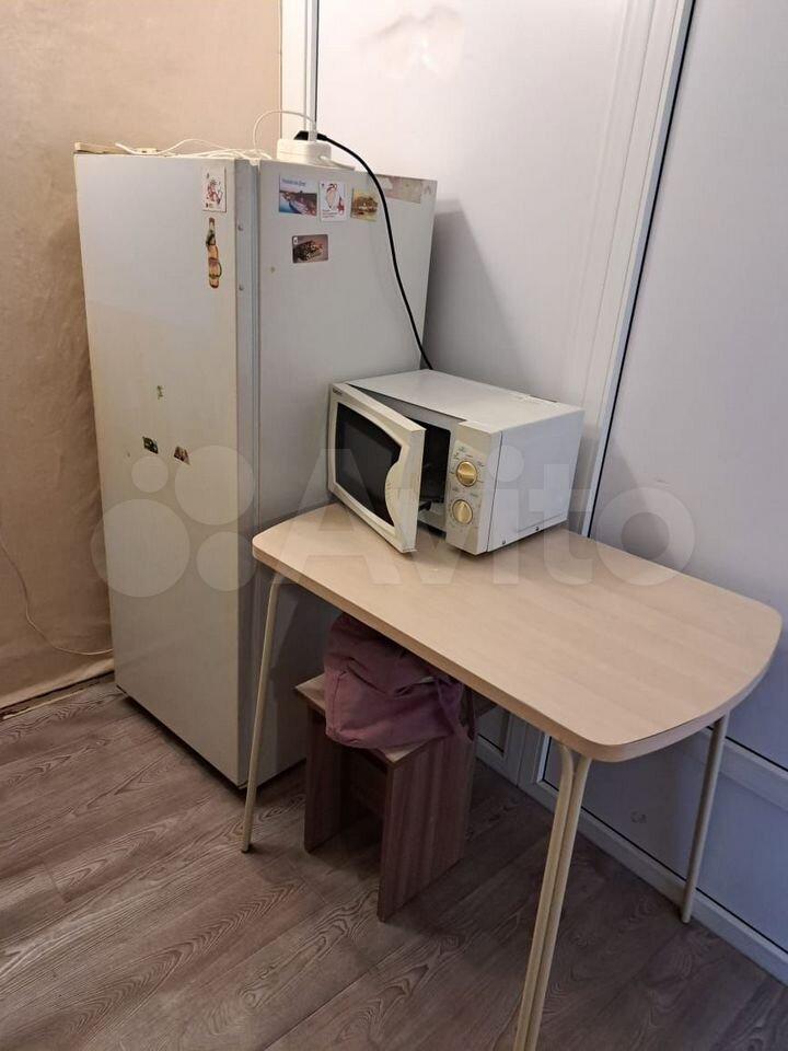 На кухне холодильник, микроволновка, стол,
