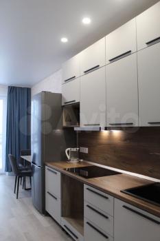 санузел - совмещённый, мебель - кухня, хранение одежды, спальные места, холодильник, плита, стиральная машина.