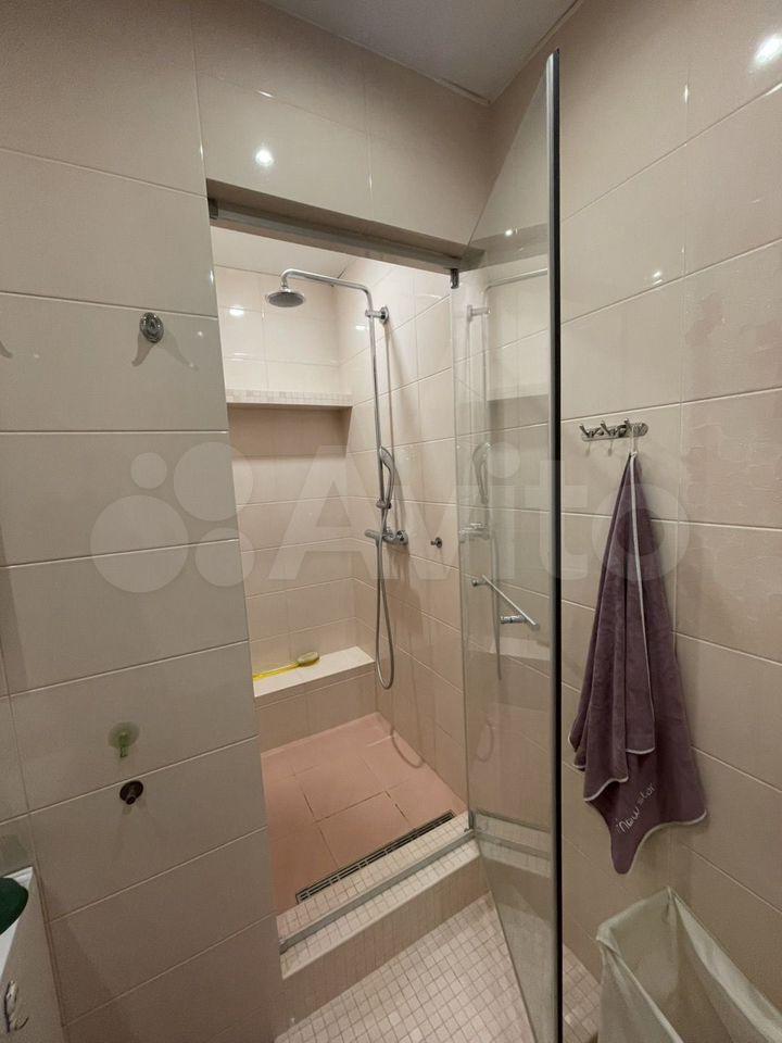 Санузел совмещенный, выполнен в светлых тонах и оснащен стиральной машиной.