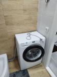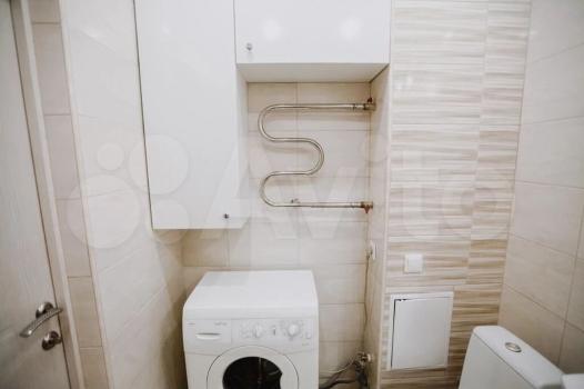 Санузел совмещенный, оформлен светлой плиткой, оснащён стиральной машиной. В прихожей предусмотрены удобные полки для верхней одежды и обуви.