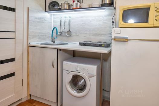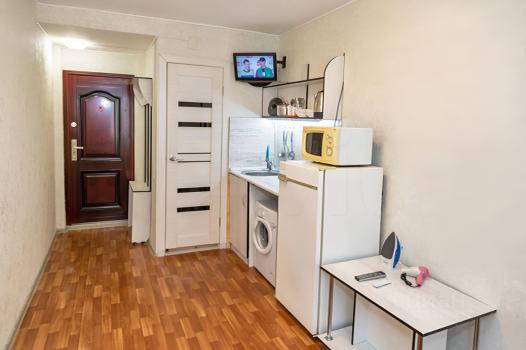 Студия полностью готова к проживанию: в комнате есть мебель, а также необходимая техника — холодильник, телевизор и стиральная машина. Ванная комната оборудована ванной. Высота потолков — 2,5 метра, что создает ощущение простора. Есть балкон, где можно отдохнуть после рабочего дня.