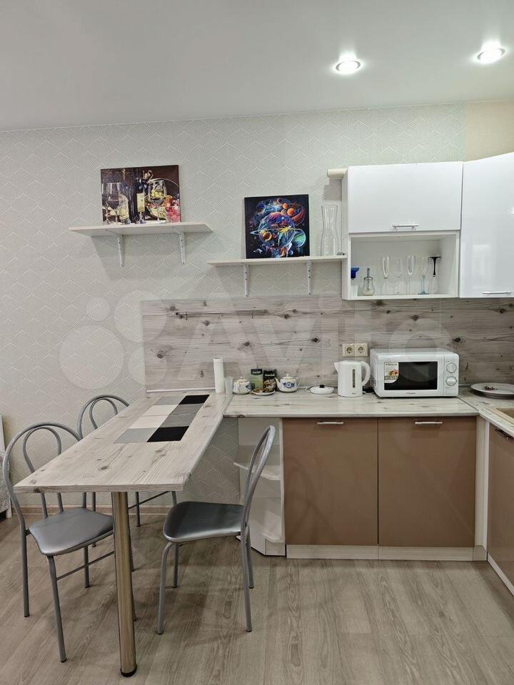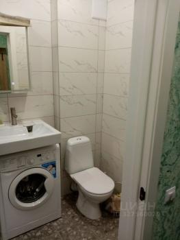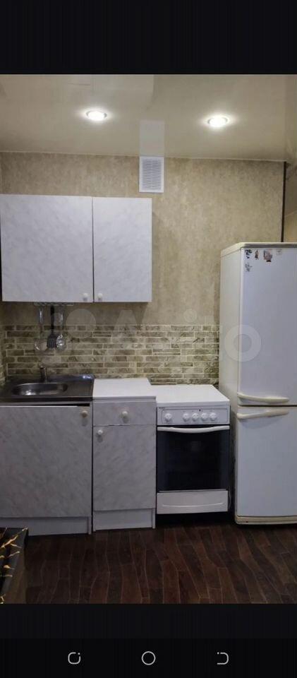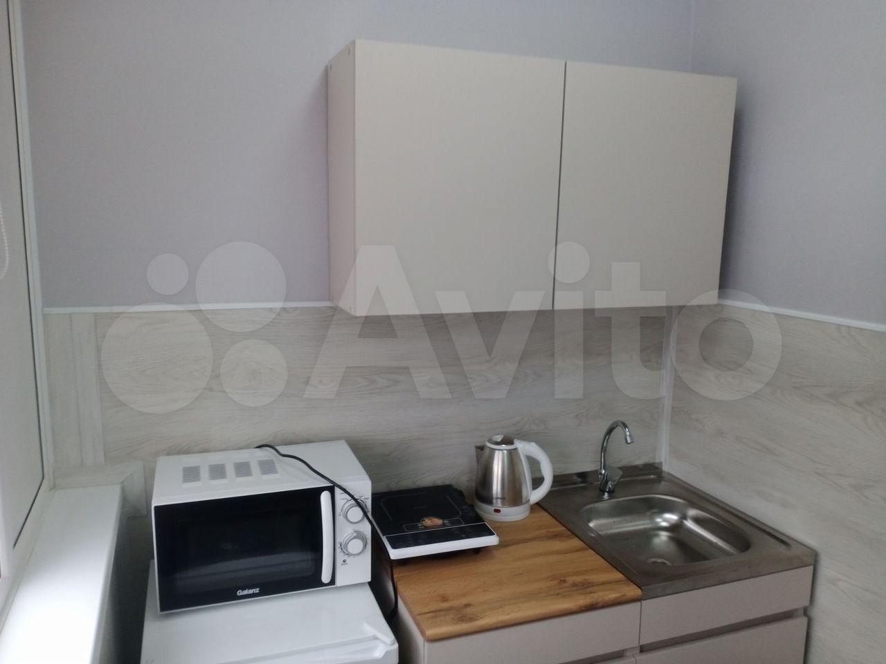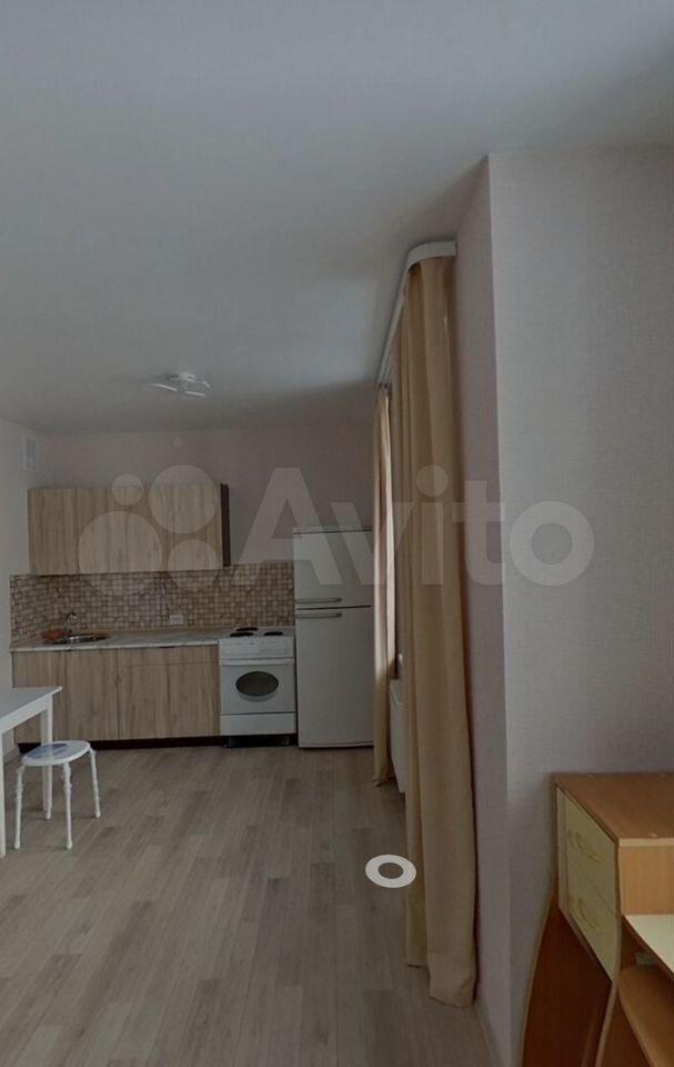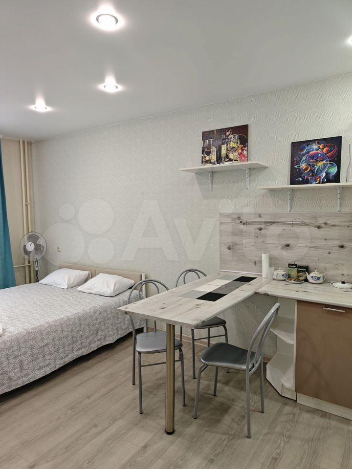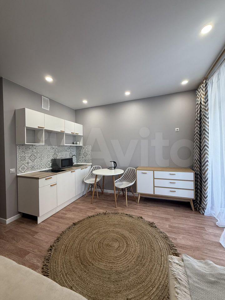В студии сделан косметический ремонт, поэтому она выглядит свежо и комфортно. Оборудована всем необходимым для жизни: есть мебель как в комнате, так и на кухне. Кухонная зона небольшая, 2 кв. м, но достаточно функциональная для приготовления еды. В квартире есть электроплита, холодильник и стиральная машина. Окна студии выходят на улицу.