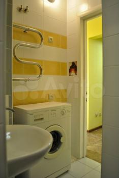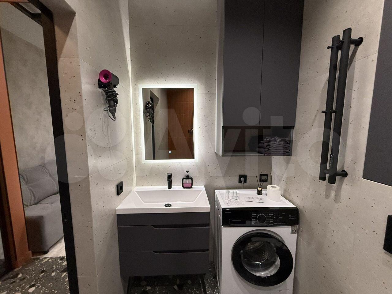 В санузле пол с подогревом. Установлен водонагреватель на 50 литров, стиральная машина. Есть гладильная доска, утюг и сушилка для белья.