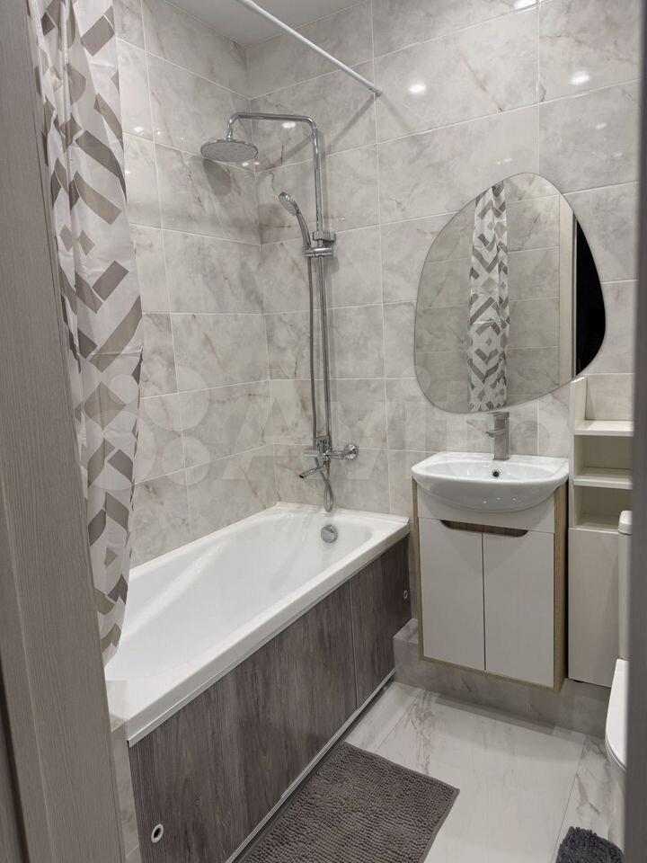 В квартире имеется вся необходимая мебель: шкафы, обеденный стол и стулья. Современная кухня оборудована холодильником, плитой и микроволновой печью. Санузел совмещенный, оснащён душевой кабиной и стиральной машиной.