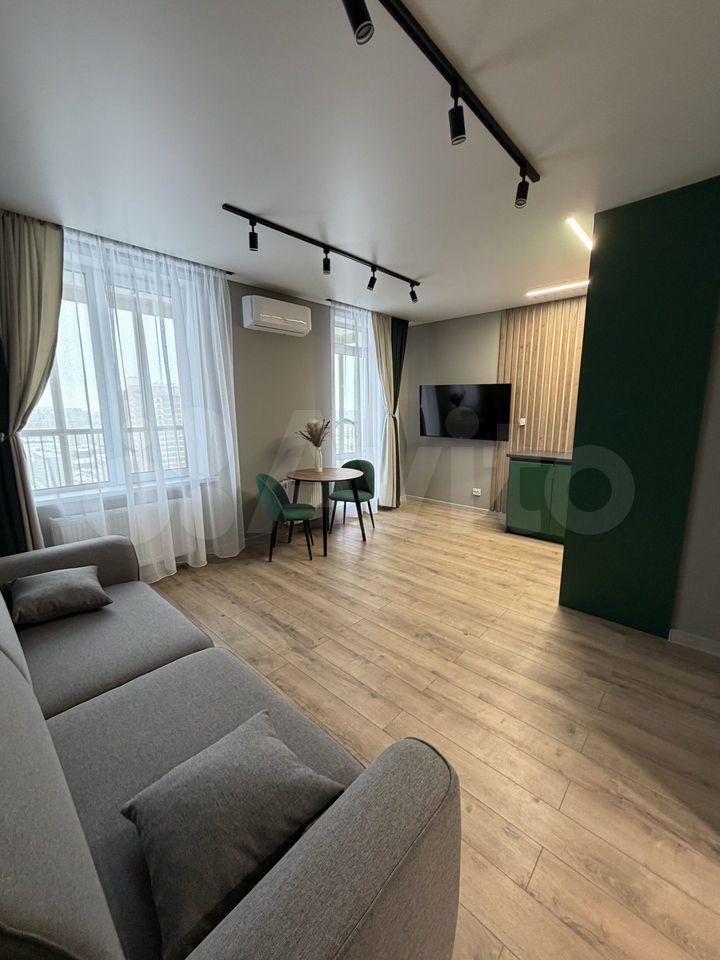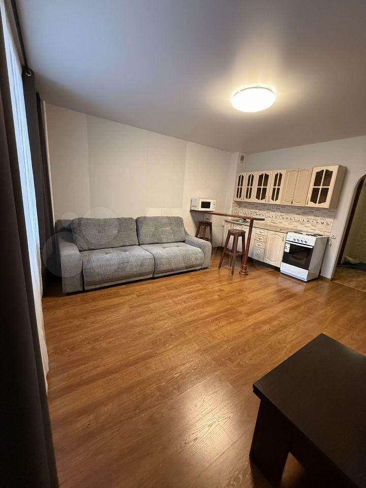 Просторная студия-гостиная со всей необходимой мебелью и техникой.