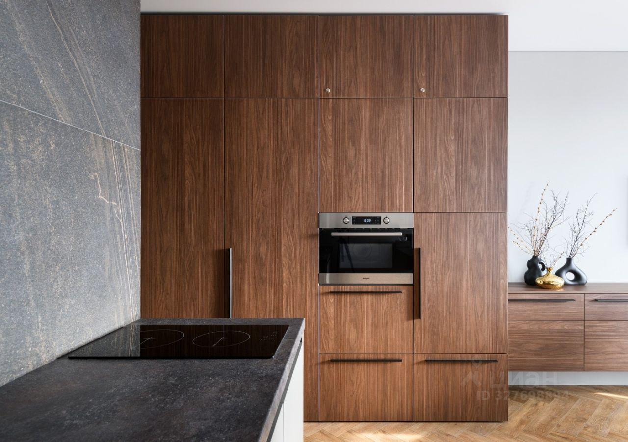 В кухне: встроенный кухонный гарнитур, холодильник, обеденный стол, электроgплита с духовкой, микроволновка, чайник.