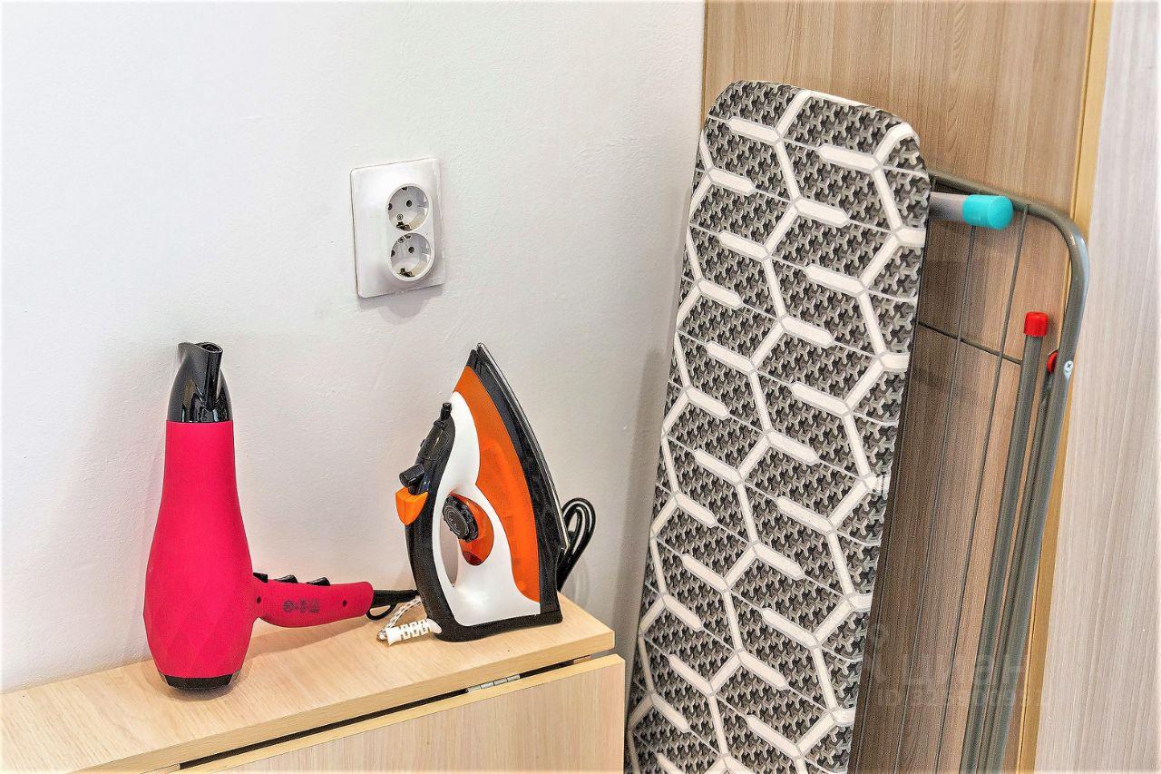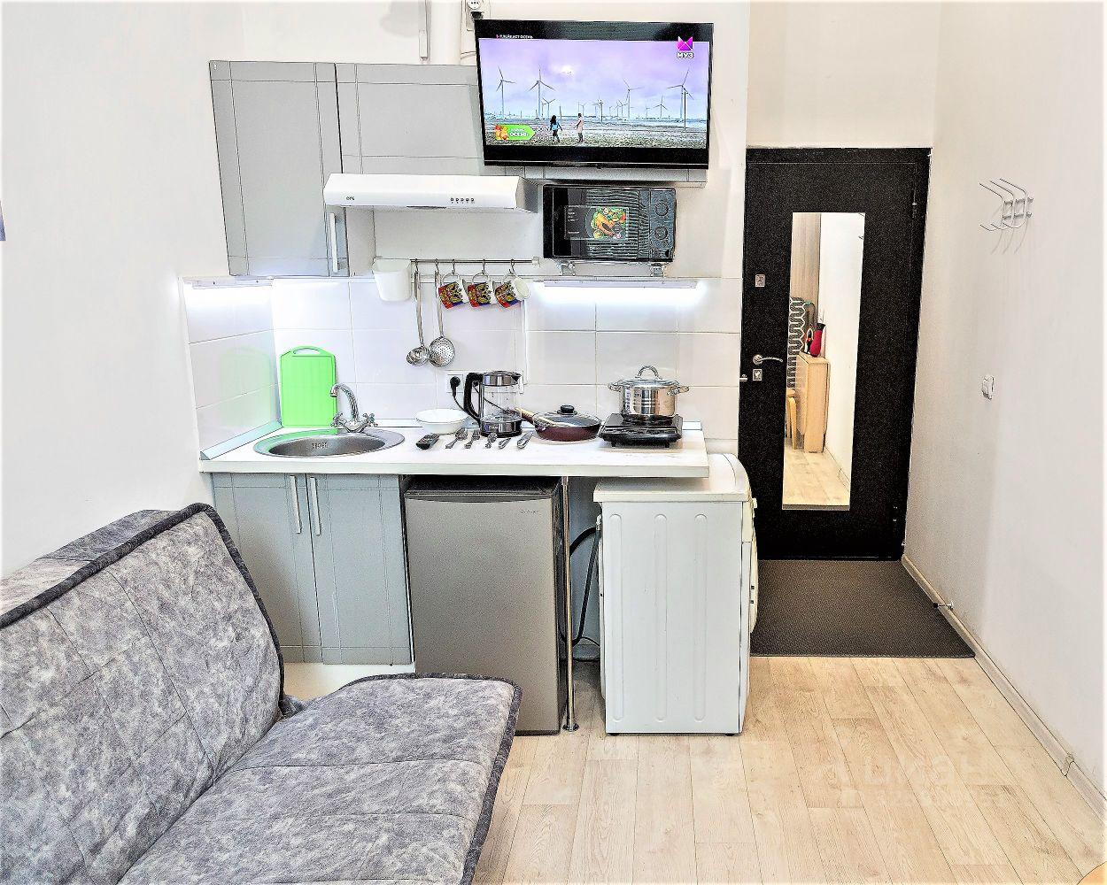 Уютная студия с необходимой мебелью и техникой. Стиральная машинка, холодильник, посудомойка, микров...