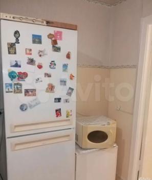 На кухне холодильник, микроволновка, стол,
