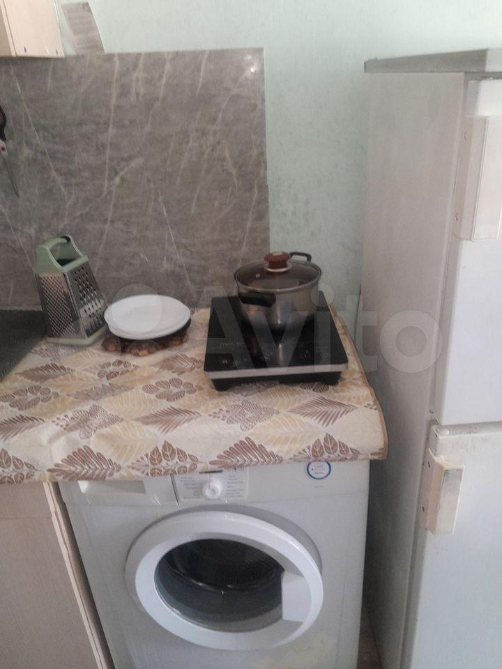 Кухня большая около 10 кв . Кухонный гарнитур , обеденная зона, холодильник , стиральная машинка, варочная панель, микроволновка , чайник.
