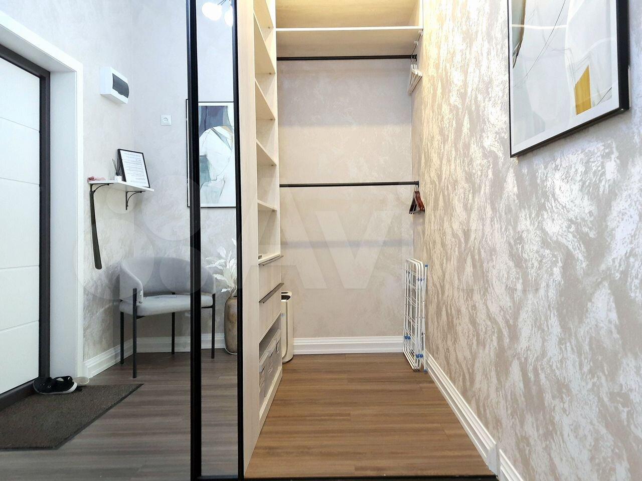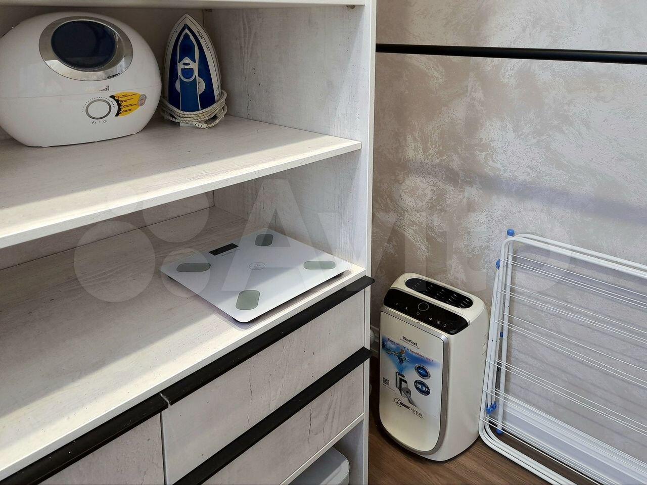 В комнате: большая кровать, смарт-телевизор большой , зеркало, тумба и отдельное место для хранения вещей (открытая гардеробная ). Шкафов нет. Напольные вешалки использую.